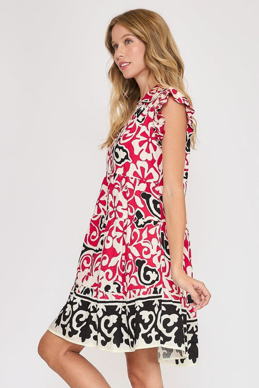 Umgee Full Size Two Tone Printed Ruffled Cap Sleeve Mini Dress tt