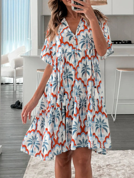 Tassel Printed Tie Neck Half Sleeve Mini Dress nt
