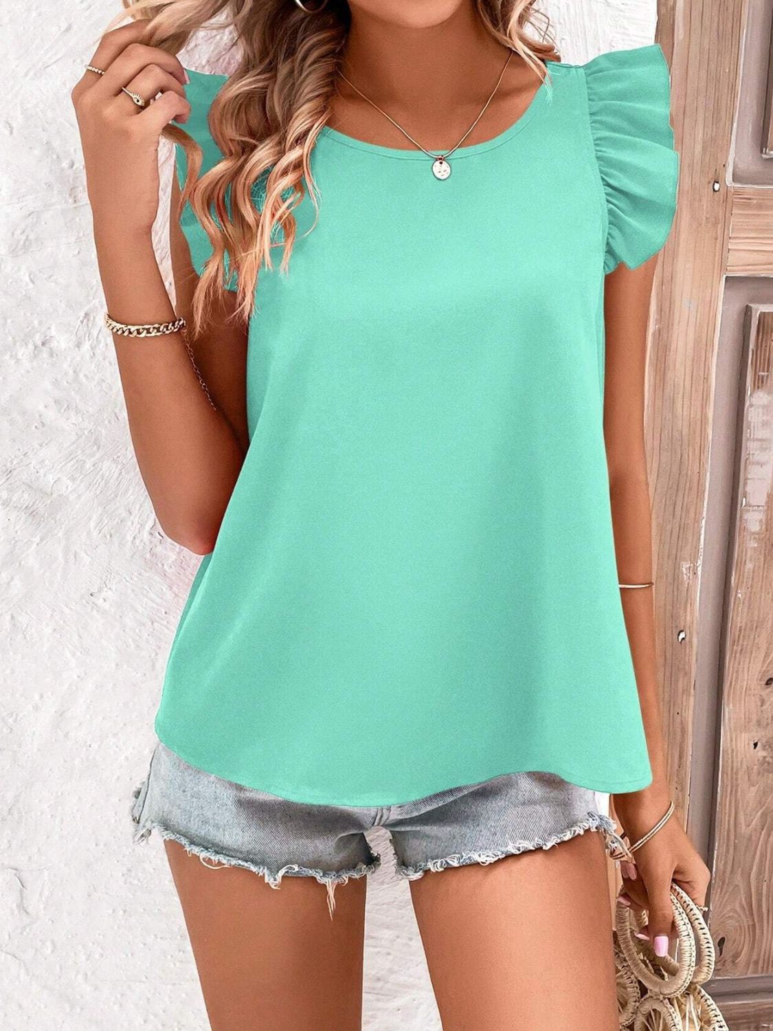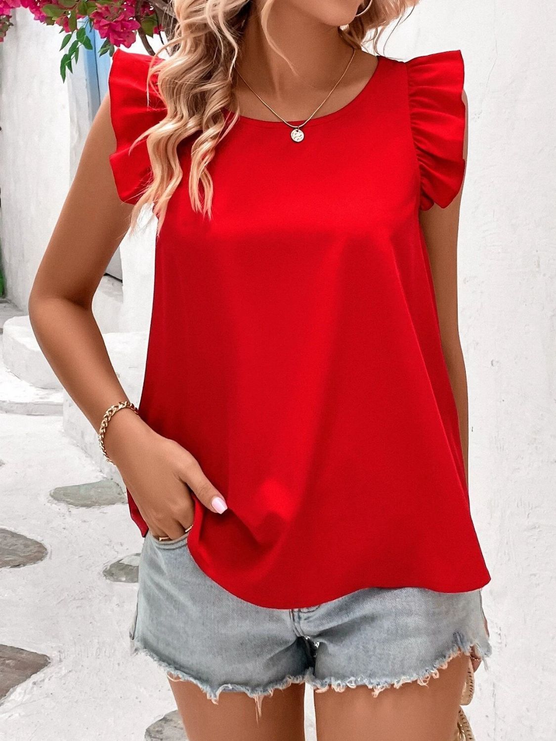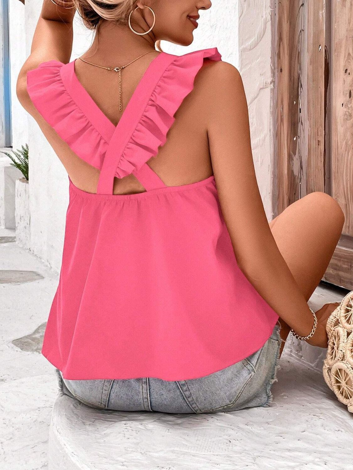 Crisscross Back Ruffled Round Neck Cap Sleeve Blouse