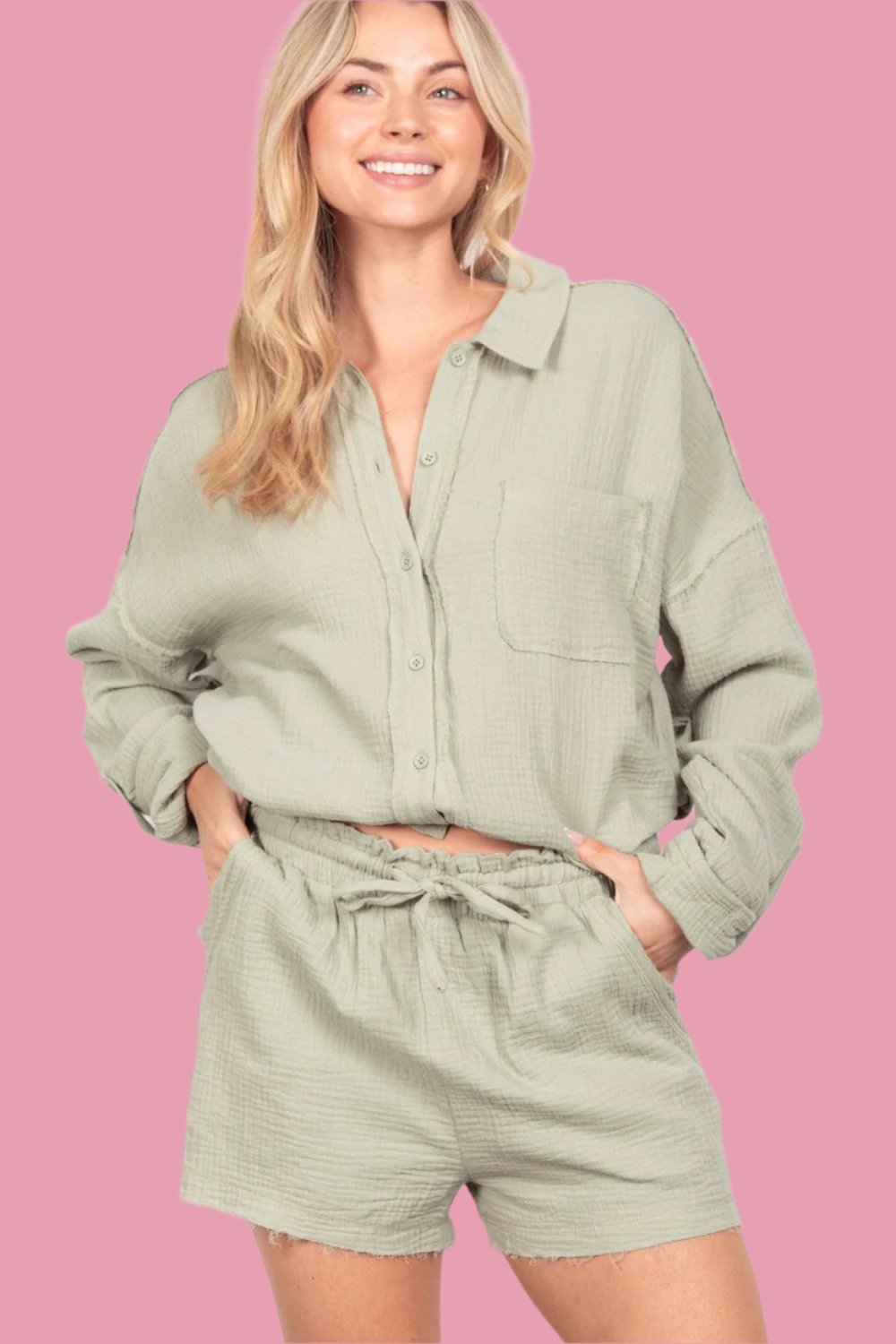 The texture button-up shirt and shorts set is a classic and stylish ensemble that offers a coordinated and put-together look. Made from a textured fabric, this set adds visual interest and depth to your outfit. The button-up shirt features a versatile design that can be dressed up or down, while the matching shorts offer comfort and style. Perfect for casual outings or summer events, this set is both fashionable and practical. Elevate your warm-weather wardrobe with the chic and versatile texture button-up shirt and shorts set. Stay effortlessly stylish and comfortable in this coordinated ensemble that will have you looking polished and on-trend all season long.