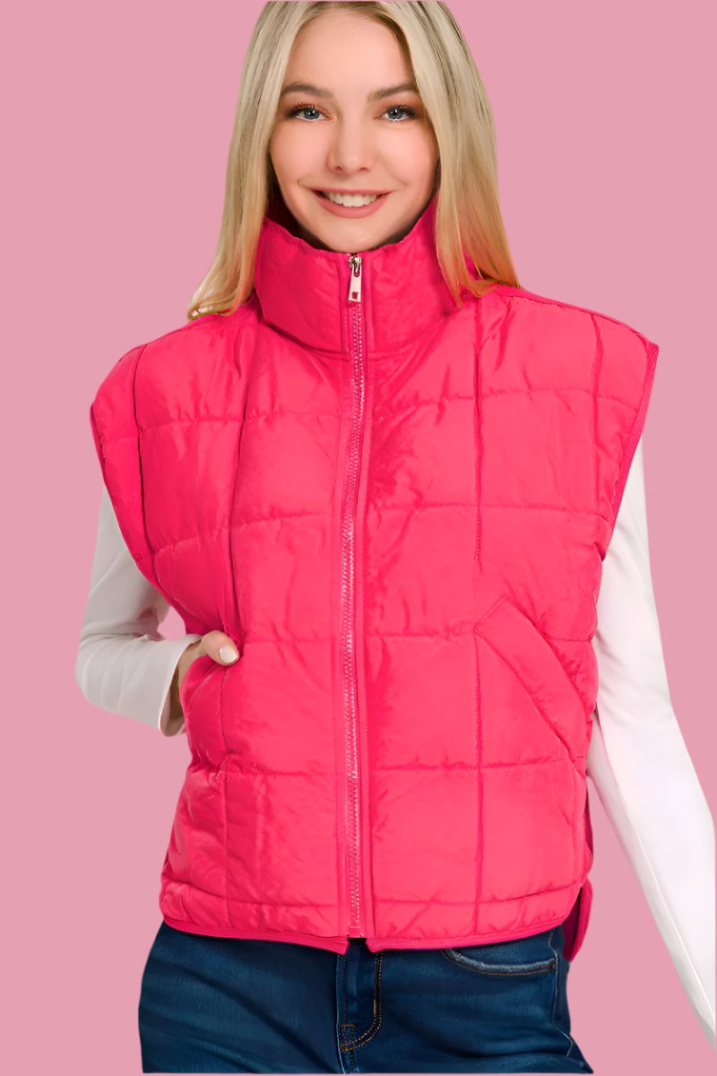 Stay cozy and stylish with this Zip Up Cropped Puffer Vest featuring convenient pockets for your belongings. Perfect for layering over your favorite tops for a trendy cold weather look. The cropped silhouette adds a modern touch to your outfit, while the puffer design provides extra warmth. Simply zip it up for easy wear and adjust the fit to your liking. This versatile vest is a great addition to your fall and winter wardrobe essentials. Upgrade your outerwear collection with this fashionable and functional piece.